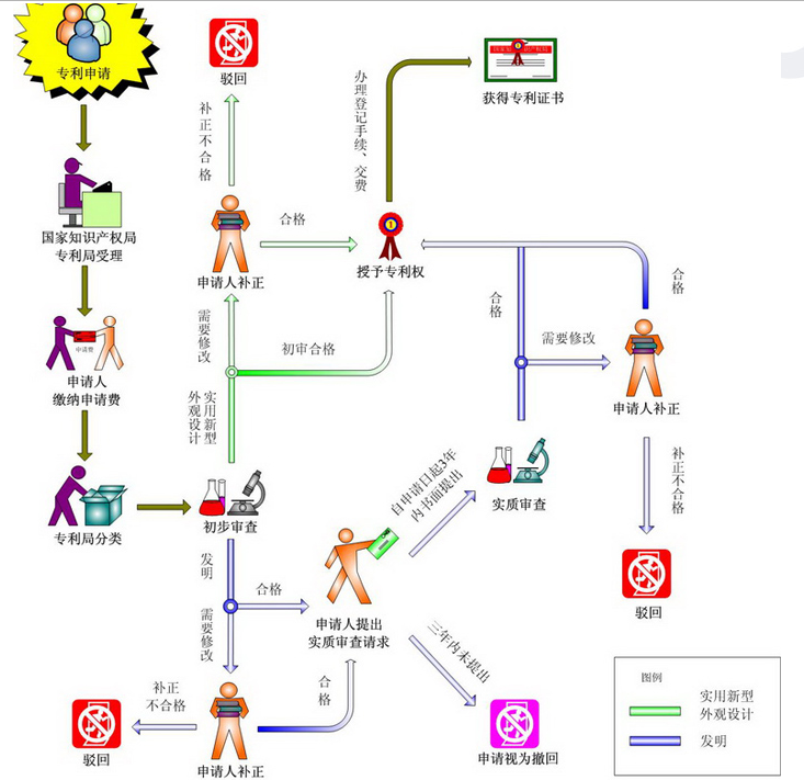 發(fā)明、實(shí)用新型和外觀設(shè)計(jì)專利的申請(qǐng)、審查流程圖如下: